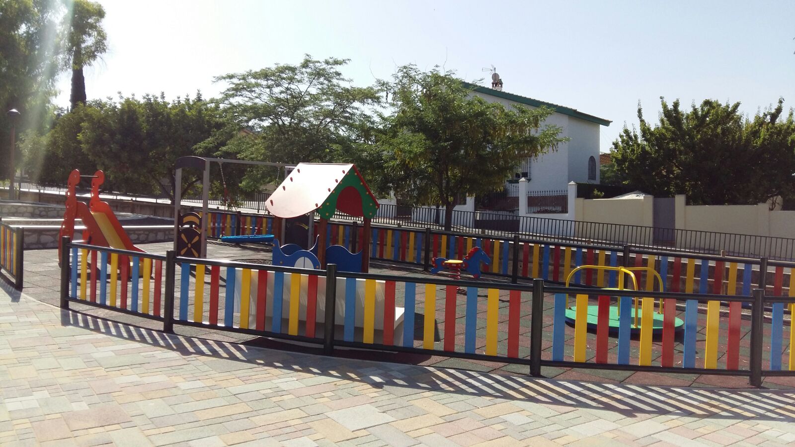 Instalaciones consistentes en la remodelación de parque infantil existente. Se retiran los antiguos juegos y se instala un columpio doble Neo, un tobogán Slide 1000, un balancín Dolly y un subebaja Gussy. Finalmente, se sustituye las losetas de cauchos desgastadas por una nueva solera de caucho “in situ” de diseño exclusivo Neopark.